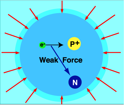 And it's here that we meet the 4th fundamental force of nature, the Weak force. The Weak Force is responsible for electrons and protons combining to become neutrons. For a star 3 to 8 times the mass of the sun, further crushing by gravity is stopped by what is called neutron pressurelike electrons, neutrons also want to keep a respectable distance from each other, although for neutrons, it's the strong force battling the squeeze of gravity. The Strong Force, 1044 times stronger than gravity, is a star's last defense to hold off total gravitational collapse. |