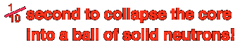 So, when no more Si is available to fuse into Fe, gravity crushes the core from being about the size of earth into a sphere 15 km across, in only one tenth of a second. During this time the Weak Force turns protons into neutrons, and a by-product of the reaction is created, a small particle called a neutrino. Neutrinos are produced in great quantities as the Weak Force turns the core into neutrons. Neutrinos don't like to interact with normal matter, so they stream out of the collapsing core at close to the speed of light, as if the star wasn't even there. So, a sudden burst of neutrinos rushes out from the star before any other change occurs on the surface. |