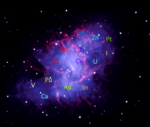 The energy of a SN explosion is so huge that elements heavier than iron are made in the debris. For the tall tower of building blocks, the supernova explosion itself provides the glue to make these large, heavy elements stable. This is how gold, silver, calcium, tin and other heavy elements are made. A supernova explosion is the only process that has enough energy to make these elements. So, any gold or silver you are wearing tonight, and even the calcium in your bones, were made in a supernova explosion eons before our sun and planets formed. |