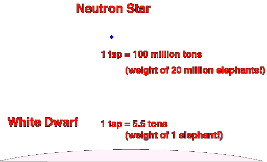 As you can see, neutron stars make white dwarfs look huge because a neutron star is so much more compact. A tsp of a neutron star would weigh about as much as Mt Everest. But Mt Everest on earth spreads its one billion tons over thousands of square miles whereas a teaspoon of neutron star spreads 3 billion tons over a couple of square inches! The crust of the earth would not be strong enough to hold it. A tsp of neutron star would crash right through the earth and out the other side.