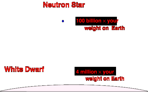 The feel of your weight on earth is just a measure of the force of gravity pulling you to earth's surface. If you have ever fallen off a ladder (or a telescope in my case!) you have a painful memory of how strong the force of gravity is between you and the earth. The more compact the planet you stand on, the stronger the gravity and the more you weigh. If you stood on a white dwarf, you would weigh an outrageous 4 million times more than what you weigh on earth, which would squash you flatter than a piece of paper. On a neutron star, you'd weigh a ridiculous one hundred billion pounds. The key to understanding neutron stars and black holes is in seeing how the compactness of an object affects the strength of gravity it generates. |
