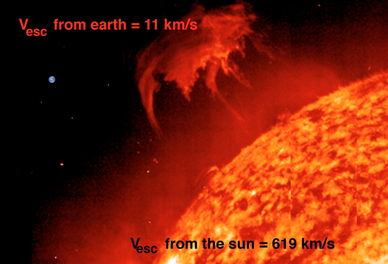 The escape velocity from the sun, however, is 619 km/s. The greater the strength of gravity, the faster you have to go to escape.
