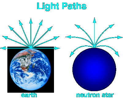 But that's not the case on a neutron star where light curves around noticeably. Imagine that while standing on a neutron star, you turn a flashlight on and point it at a wall. Instead of lighting up the wall, the photons from the flashlight are deviated downward, do you'd end up lighting the floor, instead! So let's take a trip to a neutron star. |