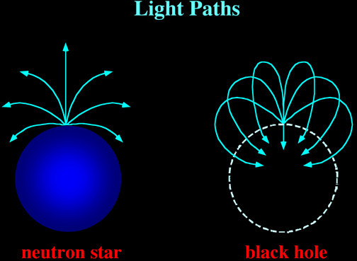 Space-time is so strongly warped here that only light goes fast enough to escape. But one hair's breadth inside the event horizon, not even light is fast enough to get away. At the event horizon, if you were to shine a flashlight straight up, the light would tumble right back to you. |
