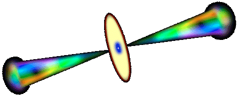Just as gas interacting with a stellar black hole causes fireworks, the interaction of gas and stars falling into a supermassive black hole, circling faster and faster as they approach, cause explosions of gas traveling near the speed of light to shoot out from the core region. These jets are visible in radio light and were discovered with high resolution radio observations around many galaxies in the late 1970's. In the image above, the galaxy itself is coincident with the tiny little dot in center, between the two enormous radio lobes. In the drawing is shown the accretion disk, the gas and stars swirling together very fast as they approach the even horizon of the supermassive black hole. |