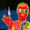 This picture was taken with film sensitive to INFRARED LIGHT at wavelengths near 9 µ (microns, or one millionth of a meter). You can see that the person radiates at 9m as does the match, but notice that the walls in the background do not, meaning that the walls are much colder than this person is. The walls do radiate their own light but at wavelengths longer than infrared, because the walls are cooler than either Jason or the match. If our eyes could respond to wavelengths of infrared light, we'd be able to see each other in the dark. Our eyes can't, but a rattlesnake's eyes can! And so can military-issue night goggles! When you look at a person with these, you're seeing the light the person himself is making and radiating. Infrared goggles and infrared cameras allow us to see light that our eyes alone canNOT see. The goggles register infrared wavelengths and translate them into an arbitrary color of visible light which we CAN see. This is called FALSE COLOR. In this picture, the different colors correspond to different intensities of light at 9m. Here, the developer of the picture chose white to indicate the strongest or brightest light at 9m and blue to show the dim areas at 9m .