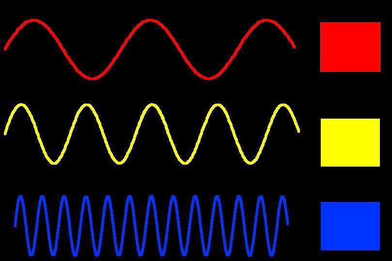Light can be described as a wave, and we perceive different wavelengths of light as different colors. For example, the wavelength of a photon of blue light is only forty thousandths of a millimeter, or 0.4 µ, whereas a red photon has a longer wavelength, about 0.7 µ.