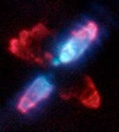 For example, on the left is a visible image (HST) of a dying star starting to release its layers out into space; notice that there is a dusty disk around the star buried inside. On the right is an infrared image (HST); the environment of this star looks quite different in infrared light, and we can use this information to study how stars transfer their material back into space.
